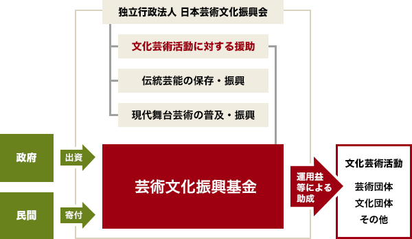 「芸術文化振興基金」は、すべての国民が芸術文化に親しみ、自らの手で新しい文化を創造するための環境の醸成とその基盤の強化を図る観点から、芸術家及び芸術に関する団体が行う芸術の創造又は普及を図るための活動、その他の文化振興又は普及を図る活動に対する援助を継続的・安定的に行います。